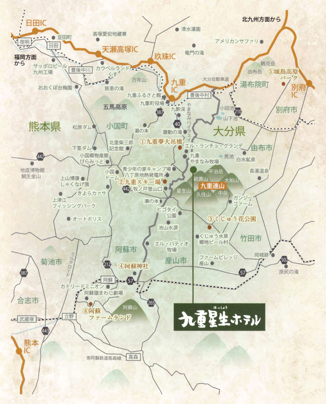 ● 九州自動車道、熊本ICより国道57号線・県道11号線(やまなみハイウェイ)にて約2時間